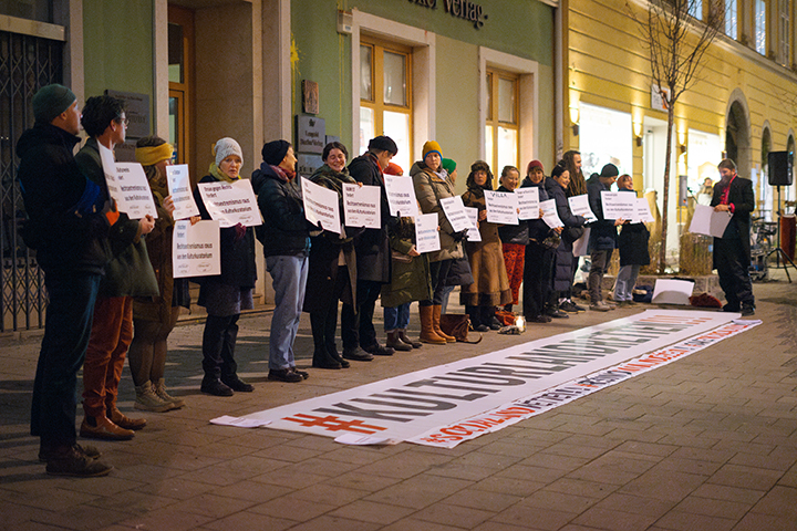 Spartenübergreifende Mahnwache vor dem Stocker-Verlag