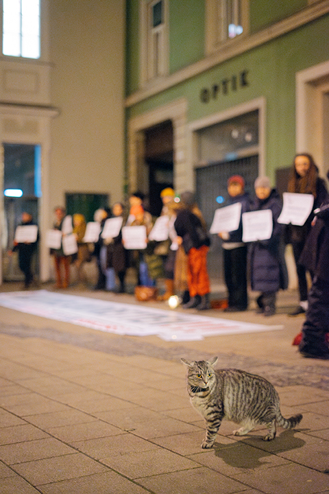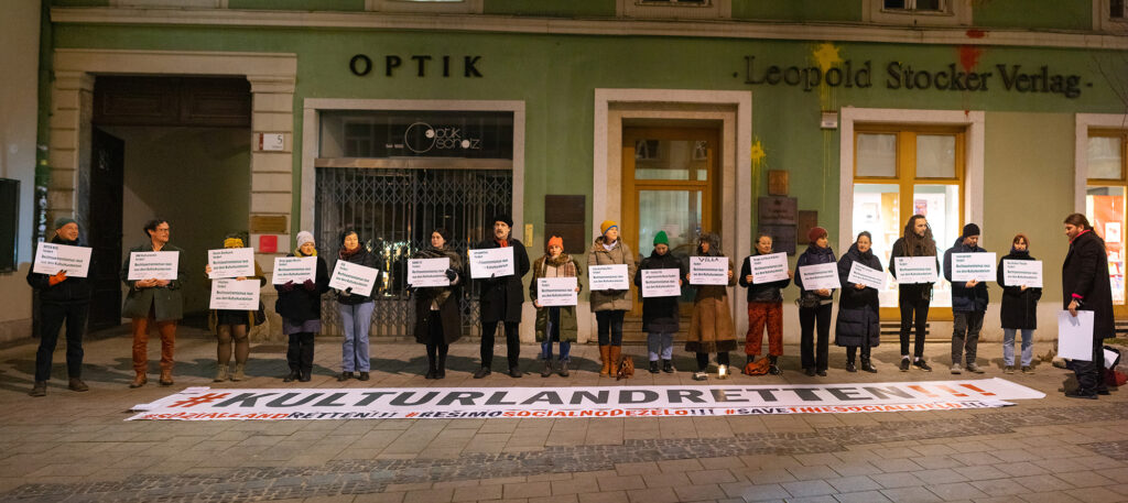18.12.: Am 18.12. von 17 bis 18 Uhr versammelten sich die Vertreter*innen von rund 20 führenden steirischen Kunst- und Kulturinstitutionen (Liste: s.u.) zu einer Mahnwache vor dem Sitz des Stocker-Verlags in der Grazer Hofgasse.